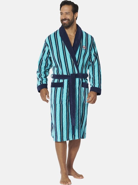 JAN VANDERSTORM ist Ihr Experte für Herrenmode in großen Größen. Der Bademantel BEKAN von JAN VANDERSTORM ist Ihr neuer Begleiter für entspannte Stunden. Der Bademantel ist mit einem klassischen Schalkragen ausgestattet und hat einen Bindegürtel, mit dem Sie ihn einfach schließen können. Ganz besonders schön ist die Außenseite in Velours-Optik und das Frottee innen. Zwei aufgesetzte Taschen bieten zudem Platz für kleine Utensilien oder Ihre Hände, wenn es frisch ist. Partien in Kontrastfarbe ergänzen das Design. Eine Stickerei auf der linken Brust verleiht dem Bademantel einen sportlichen Touch. Mit dem Bademantel BEKAN sind Sie bestens ausgestattet für gemütliche Stunden zu Hause. Material 100% Baumwolle. Maschinenwäsche.