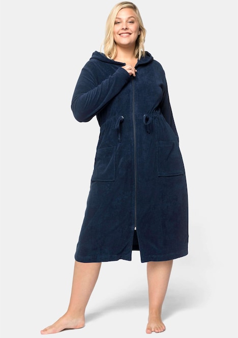 Bademantel mit Reißverschluss. Der Morgenmantel überzeugt in knielanger Form mit Kapuze. Mit dem Tunnelzugbund und Bindeband kann die Taillenweite reguliert werden. Praktische große Taschen runden das Design perfekt ab.
