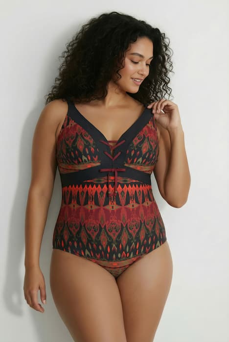 Badeanzug mit Softschalen, schönem Musterstreifen und sexy Zierschnürung im V-Ausschnitt. Ausschnitt und Einsatz unter der Büste in uni Schwarz betont. Verstellbare Träger, Unterbrustband, Vorderfutter. Hergestellt mit recyceltem Polyamid. OEKO-TEX.