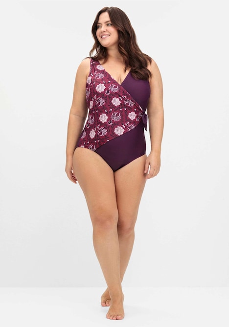 Badeanzug von sheego by Joe Browns. Der Wickelschnitt verleiht dem Badeanzug eine raffinierte Note und wird durch den farbharmonischen Blumendruck zum echten Blickfang. Ein schmückendes Detail ist der seitliche Knoten, der die Taille feminin betont. Softcups und ein Unterbrustgummi formen und stützen das Dekolleté, der V-Ausschnitt vorn und hinten streckt die Silhouette optisch.