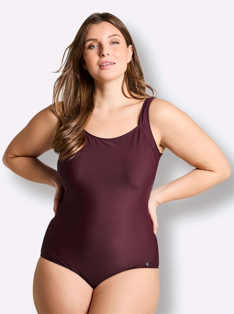 Badeanzug mit Karree-Ausschnitt. Der auf den ersten Blick schlichte Style überrascht hinten mit einem tiefen Rückenausschnitt und raffiniert zur Schleife gekreuzten Bändern. Die festen Soft-Cups formen im Zusammenspiel mit den seitlichen Raffungen ein schönes Dekolleté. Die bügellose Form sitzt bequem, die breiten Träger und das Unterbrustgummi bieten zuverlässigen Halt.