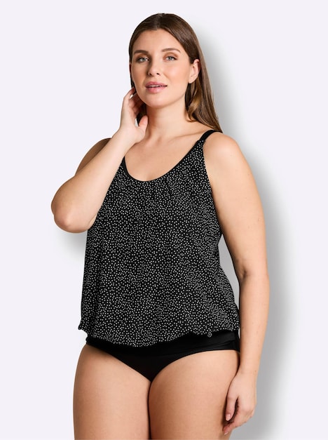 Tankini-Oberteil mit Pünktchenmuster. Durch das breite elastische Bündchen entsteht mehr Weite rund um die Bauchpartie. Die schmalen Träger sind verstellbar, stützende Softcups geben der Brust Form. Dank des Mix & Match-Charakters lässt sich dieses Oberteil wunderbar mit verschiedenen Bikinihosen aus der sheego Badekollektion kombinieren.