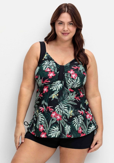 Tankini-Oberteil mit seitlicher Raffung. Der modische Tropical-Print kommt im Mix mit den unifarbenen Kontrastpartien besonders schön zur Geltung. Wattierte, vorgeformte Cups geben der Brust auch ohne Bügel Form und optimalen Halt, praktisch sind die verstellbaren, breiten Träger. Ein weiteres modisches Detail sind die Bindebändchen, mit denen der Tankini seitlich individuell gerafft werden kann. Dank des Mix & Match-Charakters lässt sich das Oberteil perfekt mit verschiedenen Bikinihosen aus der sheego Badekollektion kombinieren.