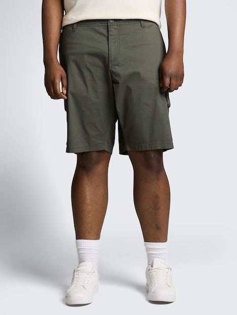 Kurze Cargohose mit seitlichen Eingriffstaschen vorne, Paspeltaschen hinten und aufgesetzten Beintaschen. Aus einem gewebten Baumwollstoff mit Stretch-Anteil.