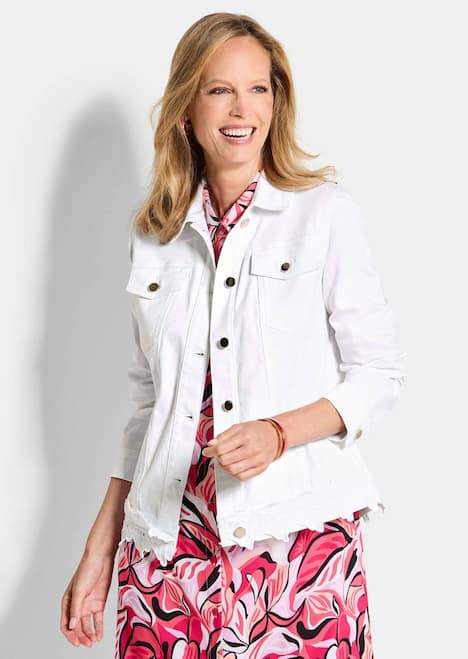 Jeansjacke, die sich perfekt zu femininen Looks kombinieren lässt: Die stilvolle Nahtführung zaubert eine schöne Taille, die Blumenborte am Saum verleiht eine romantische Note! Mit Hemdkragen, Schulterpassen, Brusttaschen mit Patten und Ärmelmanschetten. Aus stretchbequemem Baumwoll-Denim. Eisgoldfarbene Schmuckknöpfe als Verschluss. Länge ca. 64 cm in Gr. 46, ca. 61 cm in Gr. 23.