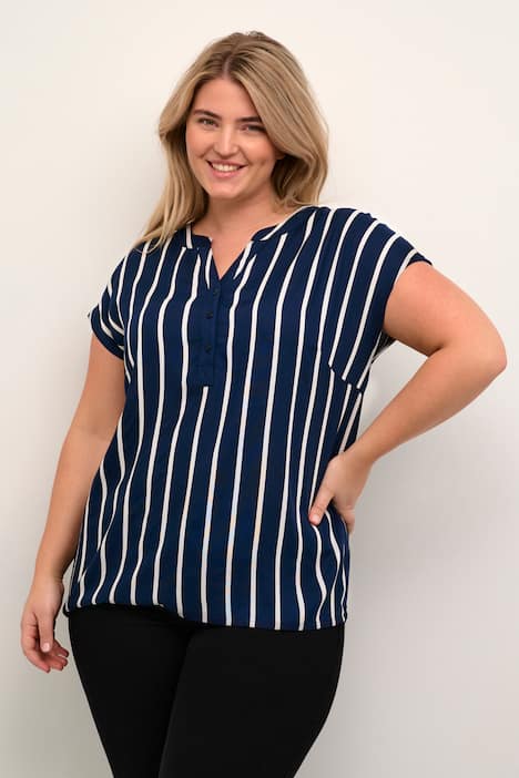 Punktbluse mit entspanntem Schnitt, kurzen Ärmeln und V-Ausschnitt samt Knopfleiste. Leichtes, weiches Material sorgt für angenehmen Tragekomfort.