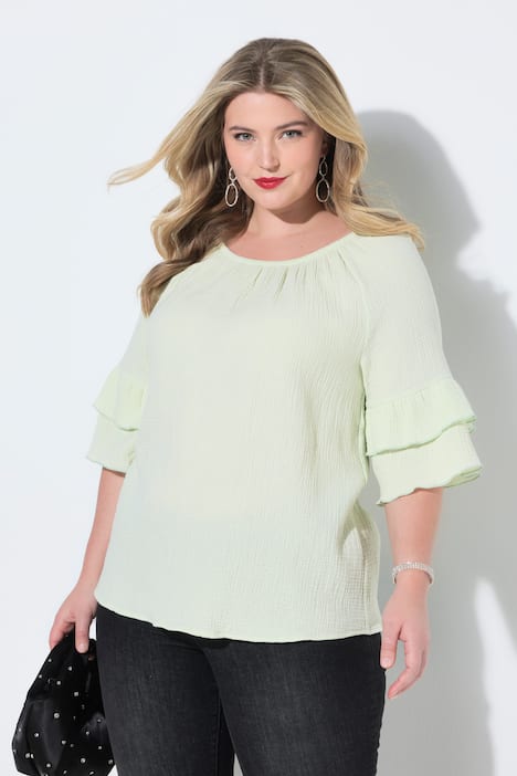 Musselin-Bluse, A-Linie, aus weichem Musselin mit elastischem Carmen-Ausschnitt - auch schulterfrei tragbar. 3/4-Raglanärmel mit Volants.