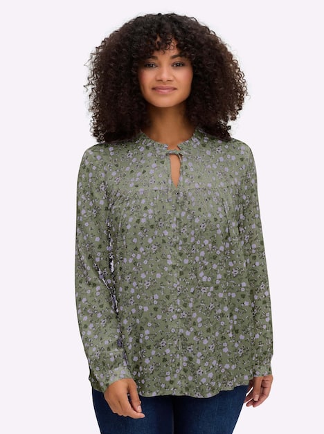 Bluse mit Blümchenprint. Das verspielte Muster wird durch die fließende Crêpe-Qualität feminin ergänzt. Der schmale Stehkragen ist mit kleinen Rüschen besetzt, eine Schleife fasst den offenen V-Ausschnitt locker zusammen. Die gerundete Brustpasse vorn und die Rückenpasse hinten sind mit Raffungen gearbeitet, die Ärmel enden mit verstellbaren Knopfmanschetten. Die Bluse besitzt eine leichte A-Linie, der abgerundete Saum umspielt Hüfte und Po.