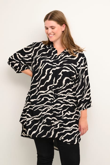 Diese Damen-Tunikabluse überzeugt durch lockere Passform, klassischen Kragen, Knopfleiste und halblange Ärmel. Die fließende Silhouette sorgt für Komfort im Alltag oder Büro.