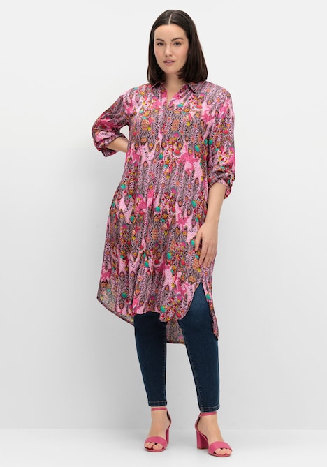Longbluse im Farb-und Mustermix von sheego loves miss goodlife. Hemdkragen und lange Manschettenärmeln sorgen für eine gepflegte Optik. Durch die extralange Oversizeform mit verlängertem Rücken und weit abgerundeten Schlitzen formt die Bluse eine moderne Silhouette und lässt sich ideal auch als Blusenjacke tragen.