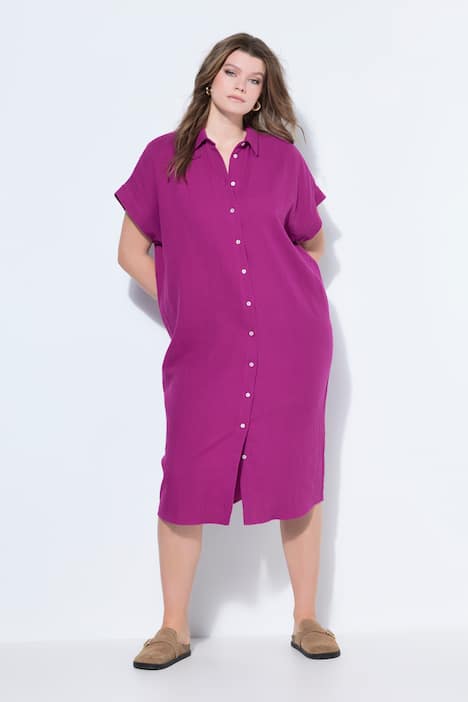Musselin-Longbluse, langer Eggshape, mit feiner Struktur. Hemdkragen, durchgehende Knopfleiste, überschnittene Schultern, Halbarm.