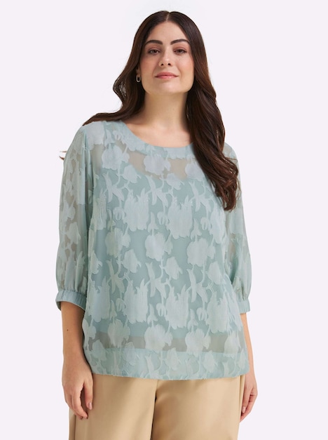 Tunika mit weitem U-Boot-Ausschnitt. Der dekorative Alloverdruck erhält durch den Ausbrenner-Effekt seine leicht transparente Optik. Auch die 3/4-langen Ärmel mit Gummizug am Saum wirken feminin und verspielt. Im Rücken sorgt ein elastischer Einsatz für Raffinesse. Mit abgerundeten, hinten etwas längeren Saum.