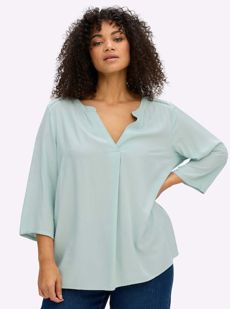 Tunika in leichter A-Linie. Der runde Ausschnitt ist mit Blende und offenem V-Schlitz gearbeitet, daran schließt sich eine mittige Falte an. So erhält das Oberteil nicht nur eine raffinierte Optik, sondern auch bequeme Weite. Locker fallende 3/4-Ärmel unterstreichen das unkomplizierte Design. Charmantes Detail ist das schmale Band aus Lochspitze auf der Schulterpasse.
