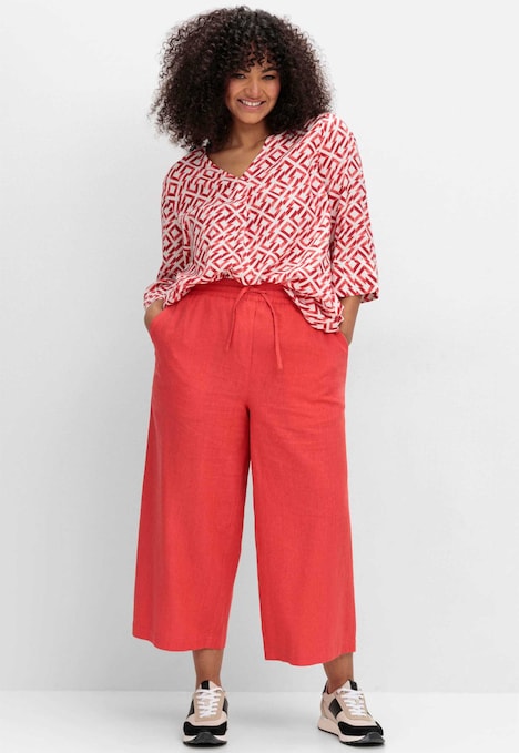 Tunika mit geometrischem Muster. Der V-Ausschnitt mit Falte verleiht dem Oberteil eine feminine Note, modisches Detail sind die 3/4-Ärmel mit geschlitzter Manschette. Eine Passe mit gelegter Falte im Rücken lässt den Schnitt locker fallen. Die dezente A-Linie und der leicht gerundete Saum mit Seitenschlitzen betonen die Silhouette auf schmeichelhafte Weise.