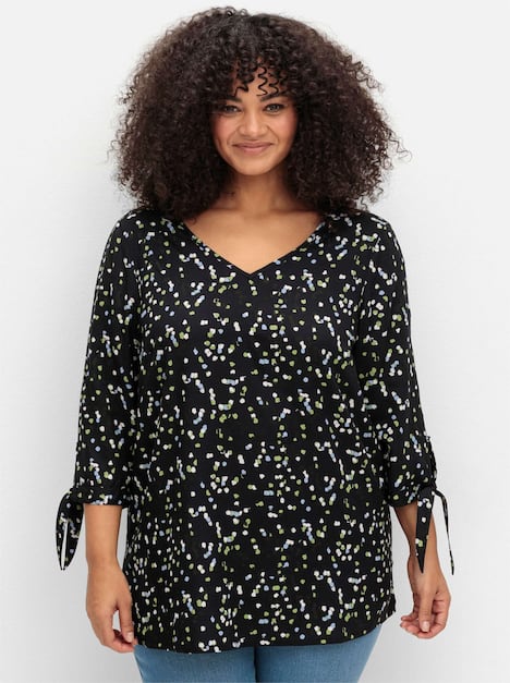 Tunika mit Alloverprint. Der grafische Print verleiht dem Oberteil eine moderne, entspannte Optik. Details wie ein etwas weiter gefasster V-Ausschnitt und 3/4-lange Ärmel mit Schlitz und Knotendetail sind dazu eine feminine Ergänzung. Dabei können die Ärmelmanschetten mit dem Bindeband individuell in der Weite verstellt werden – das sorgt für ein Plus an Tragekomfort.