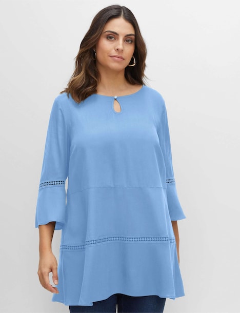 Longtunika in A-Linie. Verspielte Details sind die Lochmusterborten entlang des Saums sowie am Ärmel. Auch das Cut-out mit Schlüsselloch und Knopf am Rundhalsausschnitt wird zum femininen Eyecatcher. Die weiten 3/4-Ärmel fügen sich harmonisch in den Fit ein.