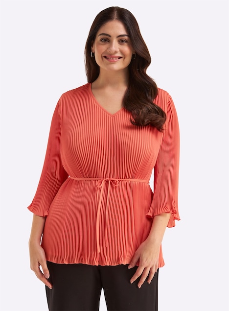 Tunika mit Plisseefalten. Der raffinierte Style zeigt sich mit V-Ausschnitt und locker fallenden Trompetenärmeln in 3/4-Länge. Das Bindeband rückt die Taille in den Fokus, der Babylock-Saum umspielt schmeichelnd die Hüfte.