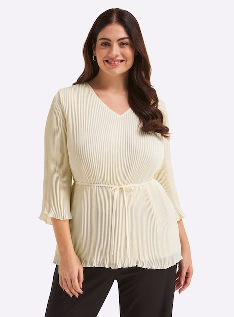 Tunika mit Plisseefalten. Der raffinierte Style zeigt sich mit V-Ausschnitt und locker fallenden Trompetenärmeln in 3/4-Länge. Das Bindeband rückt die Taille in den Fokus, der Babylock-Saum umspielt schmeichelnd die Hüfte.