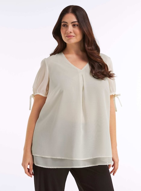 Diese Tunika beeindruckt durch die femininen Schleifen, die an den kurzen Ballonärmeln gebunden werden können. Für weitere, dekorative Details sorgen der tiefe V-Ausschnitt mit Kellerfalte. Brustabnäher runden den Look gekonnt ab.