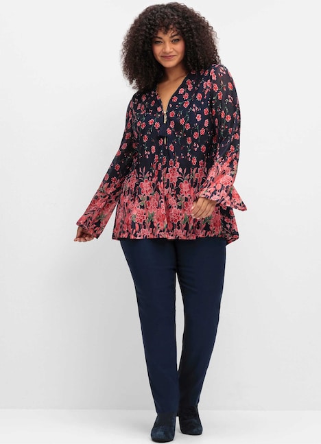 Tunika in Longform von sheego by Joe Browns. Der feminine Blumendruck kommt auf der zarten, leicht transparenten Mesh-Qualität besonders schön zur Geltung, das Innenfutter macht den Body blickdicht. Ärmel in Trompetenform und ein figurbetonter Schnitt runden den Look harmonisch ab.
