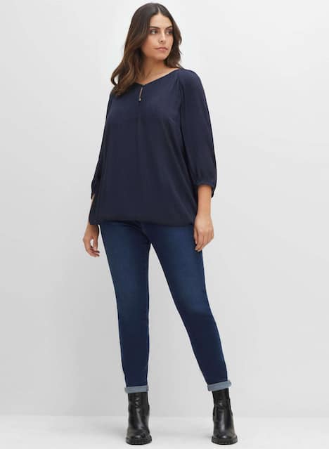 Die Tunika zeigt sich in modisch gecrinkelter Optik. Der weite V-Ausschnitt, der in eine kurze Knopfleiste übergeht, gibt ihr feminine Leichtigkeit. Die angekräuselten Raglanärmel erhalten durch die 3/4-Länge sowie den Gummizug am Abschluss eine verspielte Note. Auch der Saum schließt mit einem Gummizug ab. In lockerer Passform.