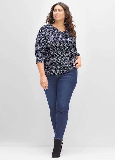 Tunika in bequemer Schlupfform. Der hübsche florale Alloverdruck verleiht dem Oberteil verspielten Charme, der streckende V-Ausschnitt ergänzt den femininen Look. Am Saum und an den 3/4-Ärmeln befinden sich leicht gekräuselte Gummizugbündchen.