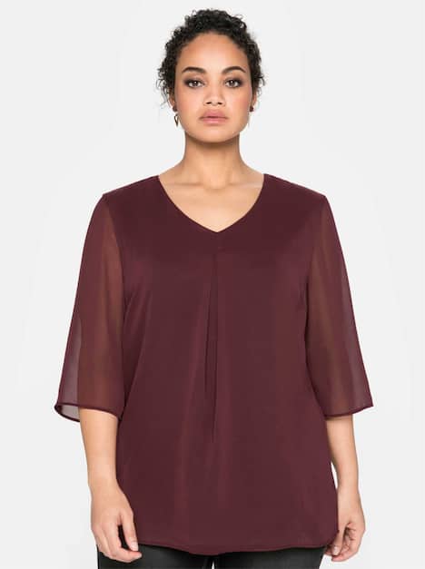 Tunika mit femininem V-Ausschnitt und dekorativer Kellerfalte vorn. Für eine raffinierte Optik sorgt die doppellagige Verarbeitung. Die obere Chiffonlage lässt nur die 3/4-Ärmel transparent, der Body wird durch die untere Lage blickdicht.