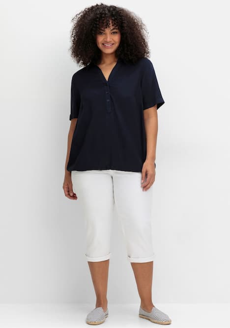 Tunika in leicht transparenter, strukturierter Qualität. Der Hemdkragen mit V-Schlitz und kurzer Knopfleiste verleiht ihr eine klassisch gepflegte Note, die strukturierte Oberfläche gibt Modernität. Die kurzen Ärmel enden mit fixiertem Aufschlag, während der gerade Saum mit Gummizugbund für eine bequeme Passform sorgt.