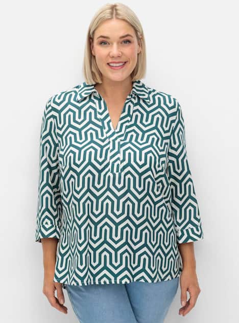 Tunika mit grafischem Alloverprint. Hemdblusenkragen, V-Ausschnitt und 3/4-Arm verleihen dem Oberteil einen gepflegten, klassischen Look. Die Rückenpartie ist länger geschnitten, die Quetschfalte sorgt für einen schönen Fall. Dekoratives Detail ist das kontrastfarbene Detail an den Seitenschlitzen im Saum.