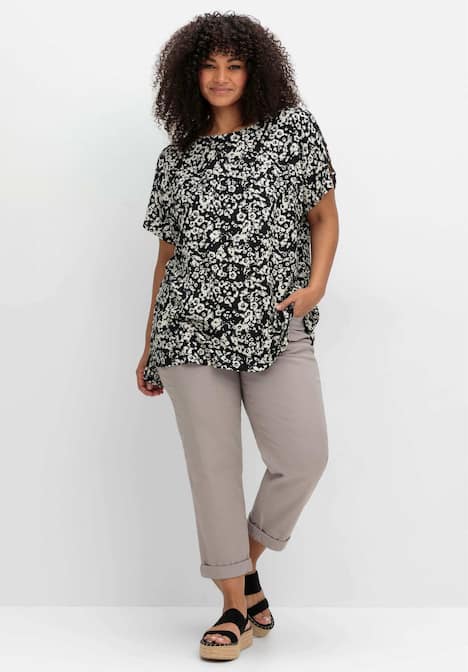Tunika mit Alloverdruck. Für den sommerlichen Look sorgen die mit Cut-Outs und Knöpfen gearbeiteten Ärmel. Durch den luftigen Oversize-Schnitt mit verlängerter Rückenpartie und Seitenschlitzen trägt sich das Oberteil besonders bequem. Zusätzlich ansprechend präsentiert sich der hohe Rundhalsausschnitt.