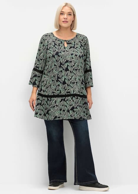 Tunika in langer A-Linie. Der wunderschöne florale Print wird durch das Lochmuster an Ärmeln und Hüftpartie feminin ergänzt. Auch der Schlüssellochausschnitt am Rundhals und die weit geschnittenen 3/4-Ärmel fügen sich harmonisch in den romantisch-verspielten Look ein.