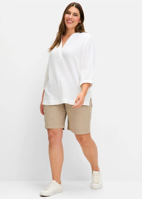 Tunika aus weichem, dezent strukturiertem Musselin. Charakteristisch sind der V-Schlitz mit markanter Blende sowie die 3/4-langen Ärmel mit weitenverstellbaren Manschetten. Der gerade Saum endet mit bequemen Seitenschlitzen.