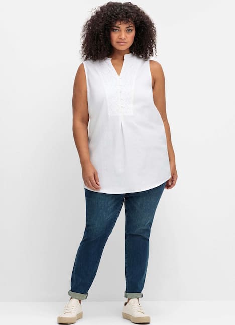 Schlicht und schön ist dieses Webtop von sheego by Joe Browns. Der feminine Look entsteht durch den aufwendigen Spitzenbesatz um den Ausschnitt und an den Schultern. Der V-Ausschnitt mit kurzem Stehkragen geht in eine Knopfleiste über.