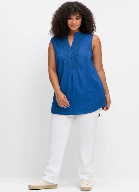 Schlicht und schön ist dieses Webtop von sheego by Joe Browns. Der feminine Look entsteht durch den aufwendigen Spitzenbesatz um den Ausschnitt und an den Schultern. Der V-Ausschnitt mit kurzem Stehkragen geht in eine Knopfleiste über.