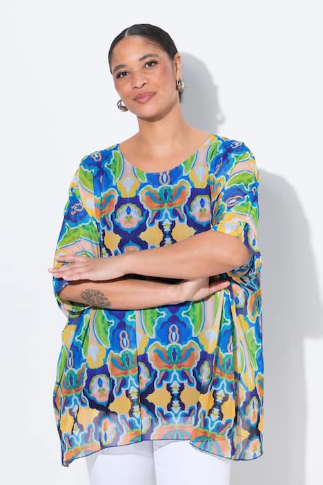 Mesh-Bluse, oversized, aus transparentem Mesh mit grafischem Muster. Darunter blickdichtes Jerseytop. Rundhalsausschnitt, breit überschnittene Schultern. Optischer Zipfelsaum.