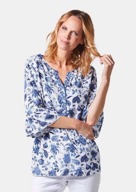 Druckbluse aus weicher, zart fließender Viskose – sehr leicht und hautsympathisch. Faszinierender Blickfang ist der topaktuelle Blütendruck in leuchtender Farbgebung. Mit Rundhalsausschnitt und farblich abgesetzter Knopfleiste im Minimaldessin. Bequeme 3/4-Ärmel, die mit verspielten Rüschen abschließen. Länge ca. 69 cm in Gr. 46.