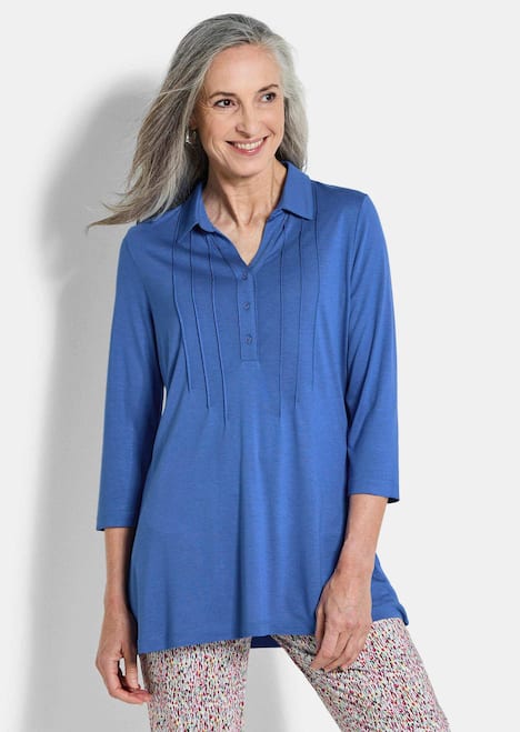 Tunikashirt mit streckenden Biesen, die nach unten aufspringen und eine schöne A-Linie zaubern – der längere Schnitt über den Po ist perfekt zu schmalen oder geraden Hosen und kaschiert die Bauchpartie vorteilhaft. Mit offenem Hemdkragen, kurzer Knopfleiste und 3/4-Ärmeln. Aus weichem Viskose-Jersey. Länge ca. 71 cm in Gr. 46, ca. 67 cm in Gr. 23.