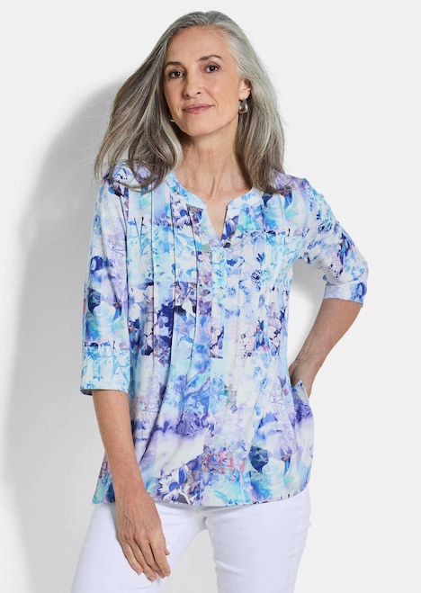 Drucktunika mit farbbrillantem Alloverdruck: Weich fließt dieses länger geschnittene Modell aus Viskose-Jersey am Körper herab und bedeckt geschickt den Po, Seitenschlitze sorgen für Bewegungsfreiheit. U-Boot-Ausschnitt mit V und kurzer Knopfleiste, alles sauber mit Blende gearbeitet. Mit 3/4-Ärmel und streckenden Biesen im Vorderteil. Länge ca. 71 cm in Gr. 46, ca. 67 cm in Gr. 23.