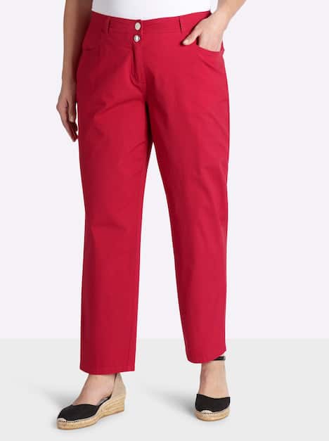 Hose in Chino-Form. Sie lässt sich mit Knopf und Reißverschluss schließen, Eyecatcher ist der zusätzliche Strassknopf am Bund. Für einen entspannten Look kann die Hose am Saum umgeschlagen und in 7/8-Länge getragen werden. Fünf Taschen runden den Style ab.