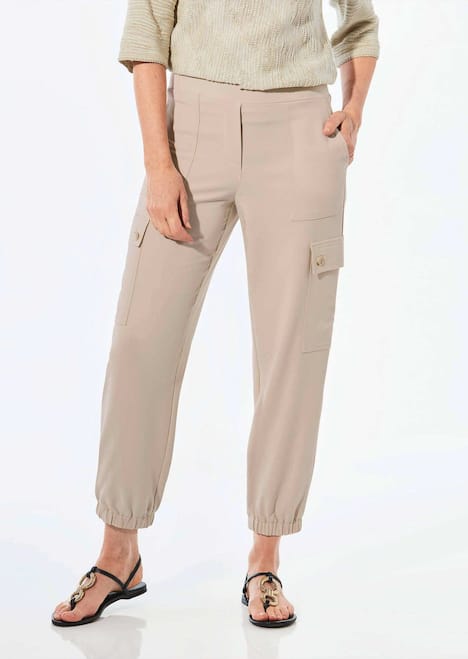 Hose im Cargo-Stil: Mit ihrem flach anliegenden Rundum-Dehnbund und der Reißverschlussoptik, die nicht aufträgt, ist sie bequem und trendig zugleich. Die französischen Eingrifftaschen mit aufgesetztem Taschenbeutel und die Taschen an der Seitennaht mit geknöpften Patten sorgen für den modernen Cargo-Look. Die etwas weitere Passform und der geraffte Saum bieten maximalen Komfort und Flexibilität. In fließender, stretchbequemer und pflegeleichter Qualität. Saumweite ca. 34 cm. Weite Beinweite.