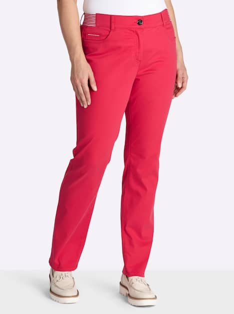 Hose im Curvy-Schnitt PIA. Diese Hose ist speziell für kräftige Oberschenkel konzipiert. Der seitlich und hinten eingearbeitete Dehnbund bietet Bequemlichkeit, das Streifenmuster macht ihn zum Hingucker. Die klassische 5-Pocket-Form rundet das Design ab.