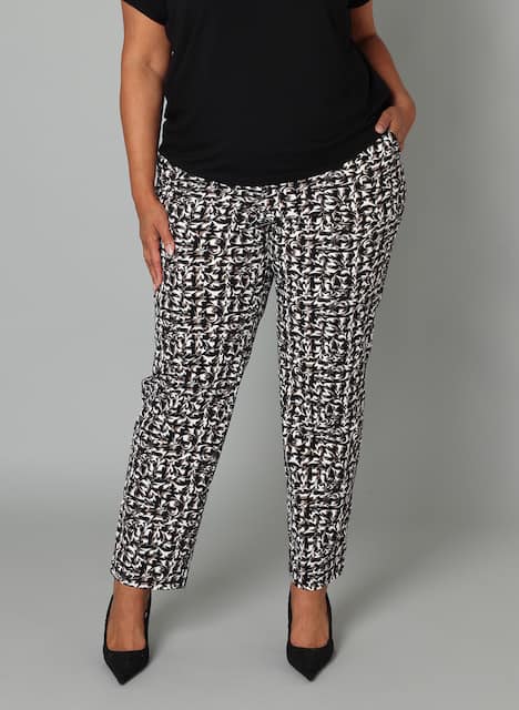 Diese Hose mit schwarzem Print ist aus einem glatten Travelstoff (75% Polyamid, 25% Elasthan) gefertigt. Der Stoff ist knitterfrei, geschmeidig und bewegt sich angenehm mit. Mit seinem Slim-Fit-Schnitt und praktischen Taschen ist dies eine bequeme und stilvolle Basis für deine Garderobe.