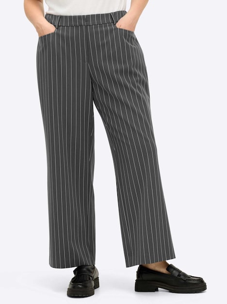 Hose mit weitem, geradem Bein. Das klassische Nadelstreifenmuster wirkt optisch streckend und den Look bürofein. Gleichzeitig sorgt der hinten eingearbeitete Dehnbund für Tragekomfort. Zu schließen ist die Hose mit Haken- und Reißverschluss sowie Sicherheitsknopf innen. Im Rücken doppelte Schlaufen geben dem Gürtel perfekten Halt, die L-förmigen Eingrifftaschen tragen nicht auf. Imitierte Taschen hinten runden den Look gepflegt ab.