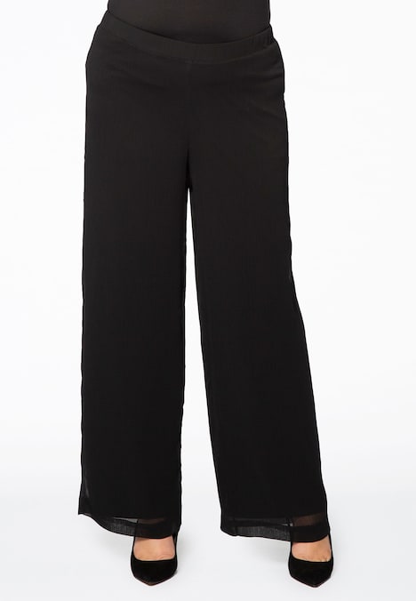 Anspruchsvolle weiten, langen Voilehosen mit einen gerippten, elastischen Bund mit Selbstbindern. Die Hose hat im Inneren eine zweifache Beschichtung, daher ist sie nicht transparent. Gut zum Kombinieren mit einer Voiletunika oder Blusen mit Aufdruck.