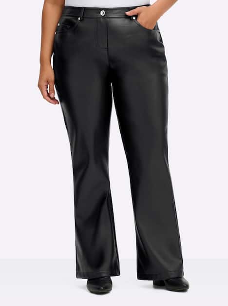 Diese Hose in Bootcut-Form erhält ihren unvergleichlichen Look durch das Lederimitat. Die 5-Pocket-Form besteht aus zwei Fronttaschen, einer Münztasche und zwei aufgesetzten Gesäßtaschen. Verschlossen werden kann der Style durch einen Reißverschluss mit Knopf vorn. Gürtelschlaufen und der Sattel hinten runden den Look ab. Die Seitennaht ist ansprechend vorverlegt.