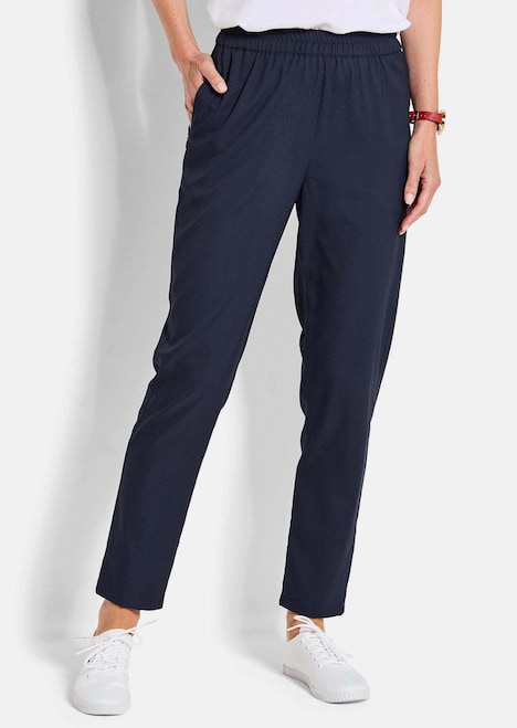Hose SARA mit Rundumschlupfbund, die sich durch höchsten Komfort auszeichnet: Die knitterfreie, pflegeleichte Qualität ist stretchbequem, der konische Schnitt bietet mehr Weite am Oberschenkel und wirkt figurschmeichelnd. Seitliche Reißverschlusstaschen und Leistentaschen im Rückteil runden das Modell gekonnt ab. Saumweite ca. 38 cm. Konischer Beinverlauf.