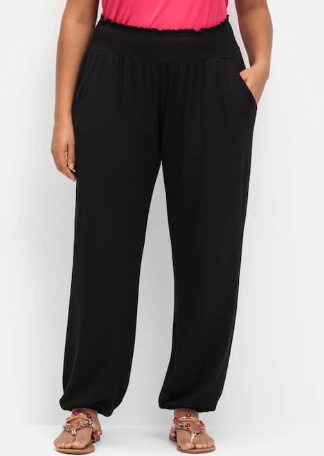 Strandhose aus Jersey. Der breite Smokbund und der Beinabschluss mit Gummizugbündchen sorgen für einen bequemen Sitz und eine sportive Optik. Seitliche Eingrifftaschen ergänzen den Look. Perfekt für entspannte Freizeitaktivitäten oder einen Urlaubstag!