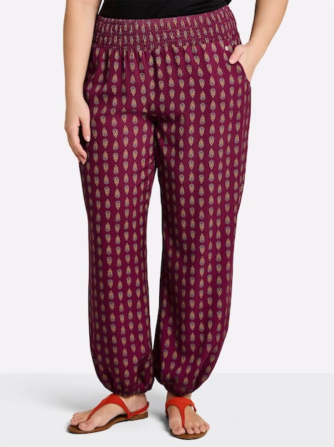 Weite Hose in bequemer Schlupfform – perfekt für Sommer, Strand und Urlaub. Der breite, gesmokte Bund trägt sich herrlich bequem, das locker sitzende Bein wird am Saum mit einem elastischen Bündchen zusammengefasst. Der charmante Alloverdruck unterstreicht den lässigen Boho-Look.