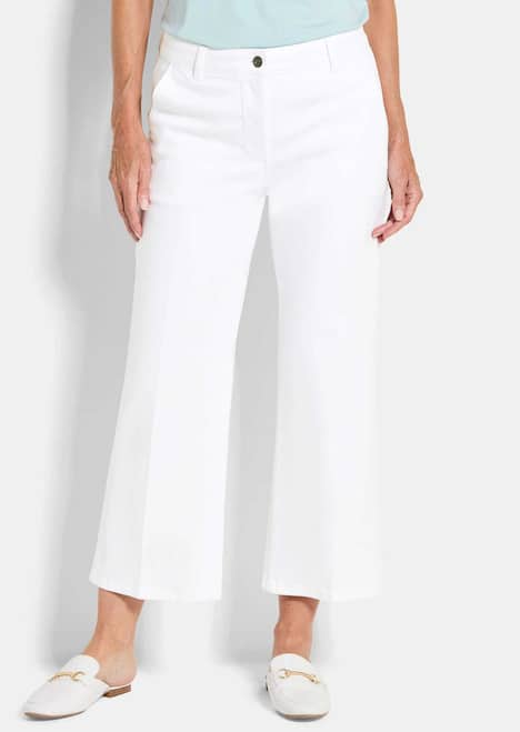 Jeans-Culotte VERA mit Formbund. Das weite Bein bekommt mit einer Bügelfalte vorne und hinten ein modisches Update und sorgt so für einen gepflegten Look. Aus stretchbequemer Denim-Qualität für besten Tragekomfort. Klassisch mit Gürtelschlaufen, Knopf und Reißverschluss. Seitliche Eingriffstaschen und angedeutete Leistentaschen hinten runden das Modell ab. Saumweite: ca. 58 cm. Weiter Beinverlauf.