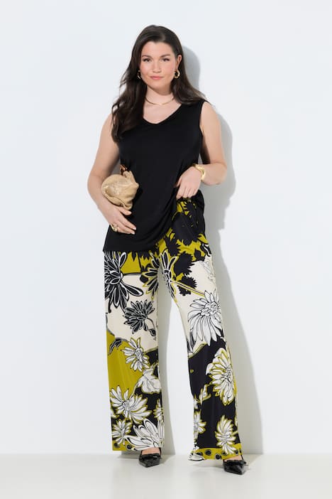 Slinky-Piqué-Hose, weites, gerades Bein. Aus edlem Slinky-Piquéjersey mit feiner Struktur, Blüten-Design und Saumbordüre. Elastikbund. Die hochwertige, sehr glatte und etwas schwerere Slinkyqualität fühlt sich besonders weich und angenehm an und hat einen fließenden Fall. Die Elastizität des Stoffes sorgt für einen hohen Tragekomfort.
